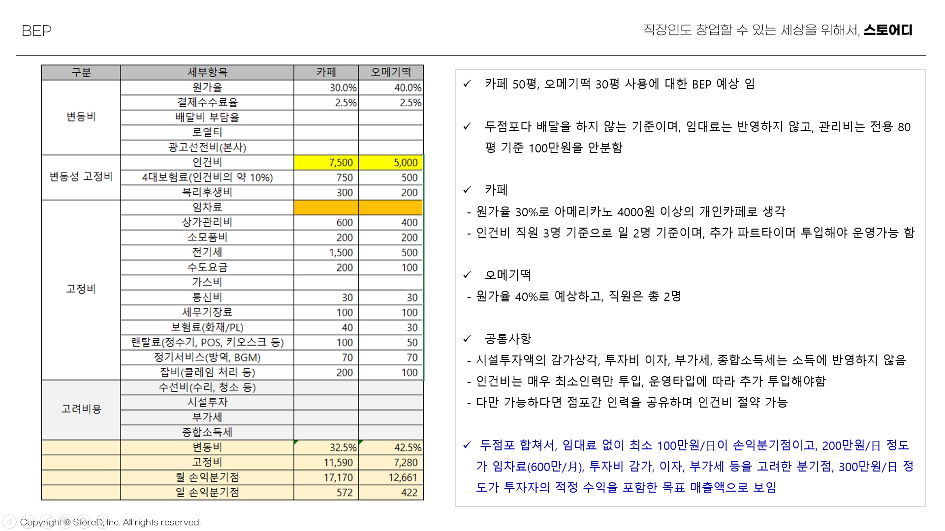 손익분기점, 손익 계산, 적정 임대가, 예상 인건비 산출